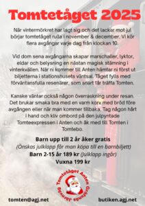 Välkommen Biljetterna till årets Tomtetåg är nu slutsålda! Årets Tomtetåg kommer rulla 23/11, 29/11, 30/11, 6/12 & 7/12.